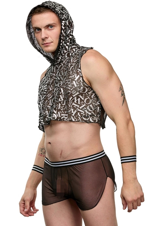 Ролевой костюм для мужчин «Боксёр» состоит из 3 предметов: топа с капюшоном, прозрачных шорт и напульсников.